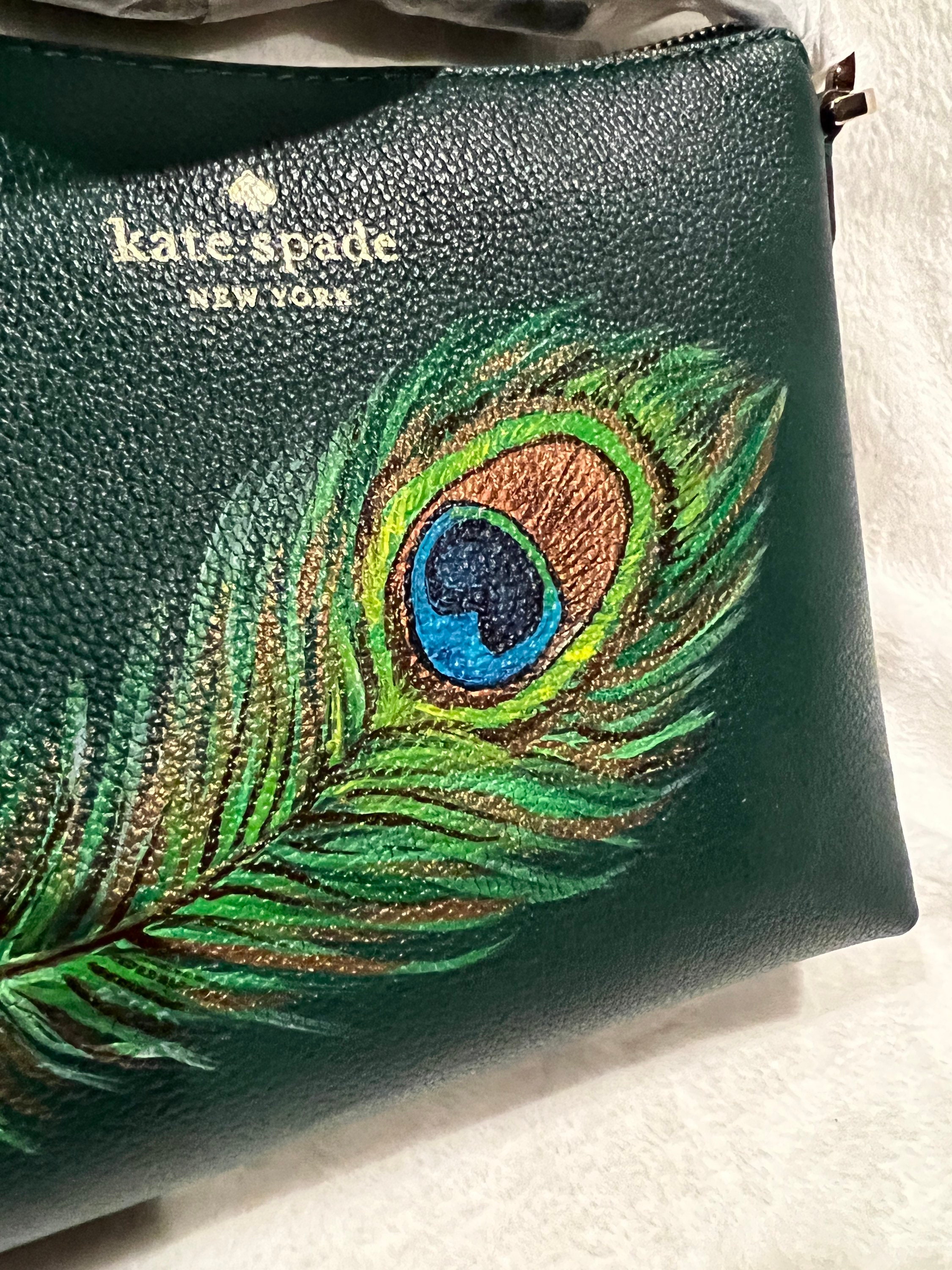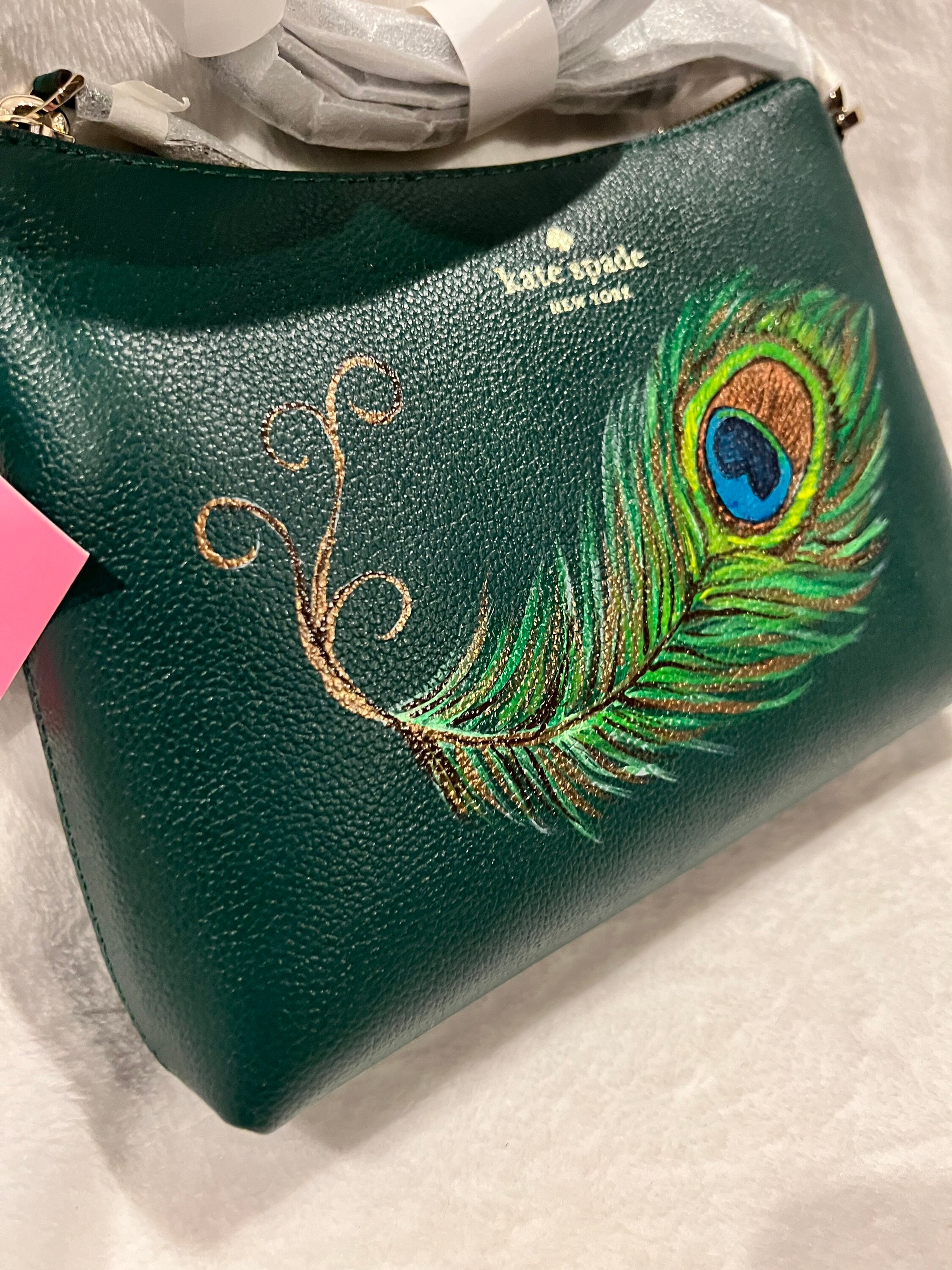 Hand painted peacock feather handbag purse. Created from a new with tags ($299 retail) dark green leather crossbody style handbag.